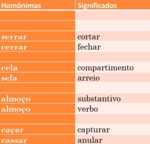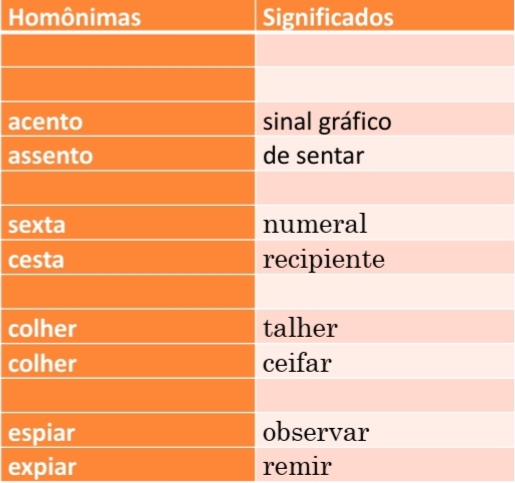 Palavras homônimas: são aquelas que têm a mesma pronúncia ou grafia e significados diferentes.